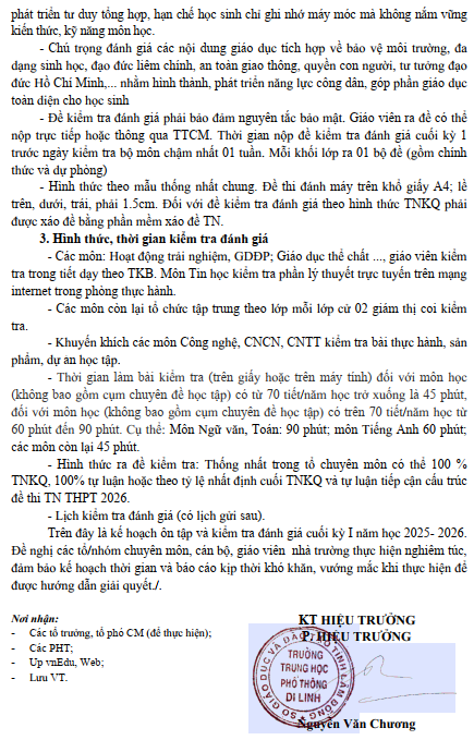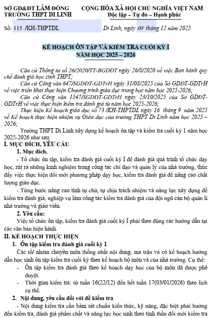 KẾ HOẠCH ÔN TẬP VÀ KIỂM TRA CUỐI KỲ I NĂM HỌC 2025 – 2026