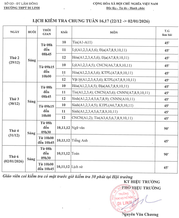 LỊCH THI CUỐI HỌC KÌ I NĂM HỌC 2025-2026