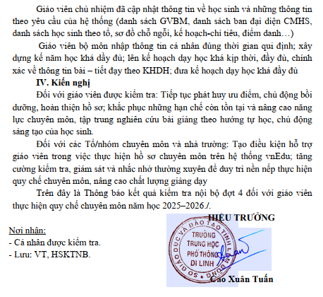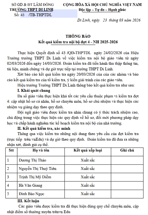 THÔNG BÁO KẾT QUẢ KIỂM TRA NỘI BỘ ĐỢT 4 NĂM HỌC 2025-2026
