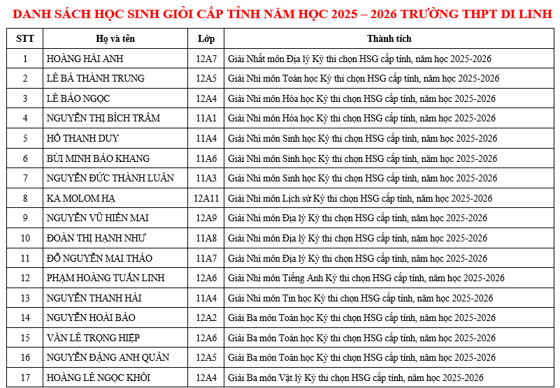 Kỳ thi chọn Học sinh giỏi cấp tỉnh năm học 2025 – 2026 đã khép lại với những kết quả ấn tượng, ghi dấu sự nỗ lực bền bỉ và tinh thần học tập đầy quyết tâm của thầy và trò Trường THPT Di Linh.